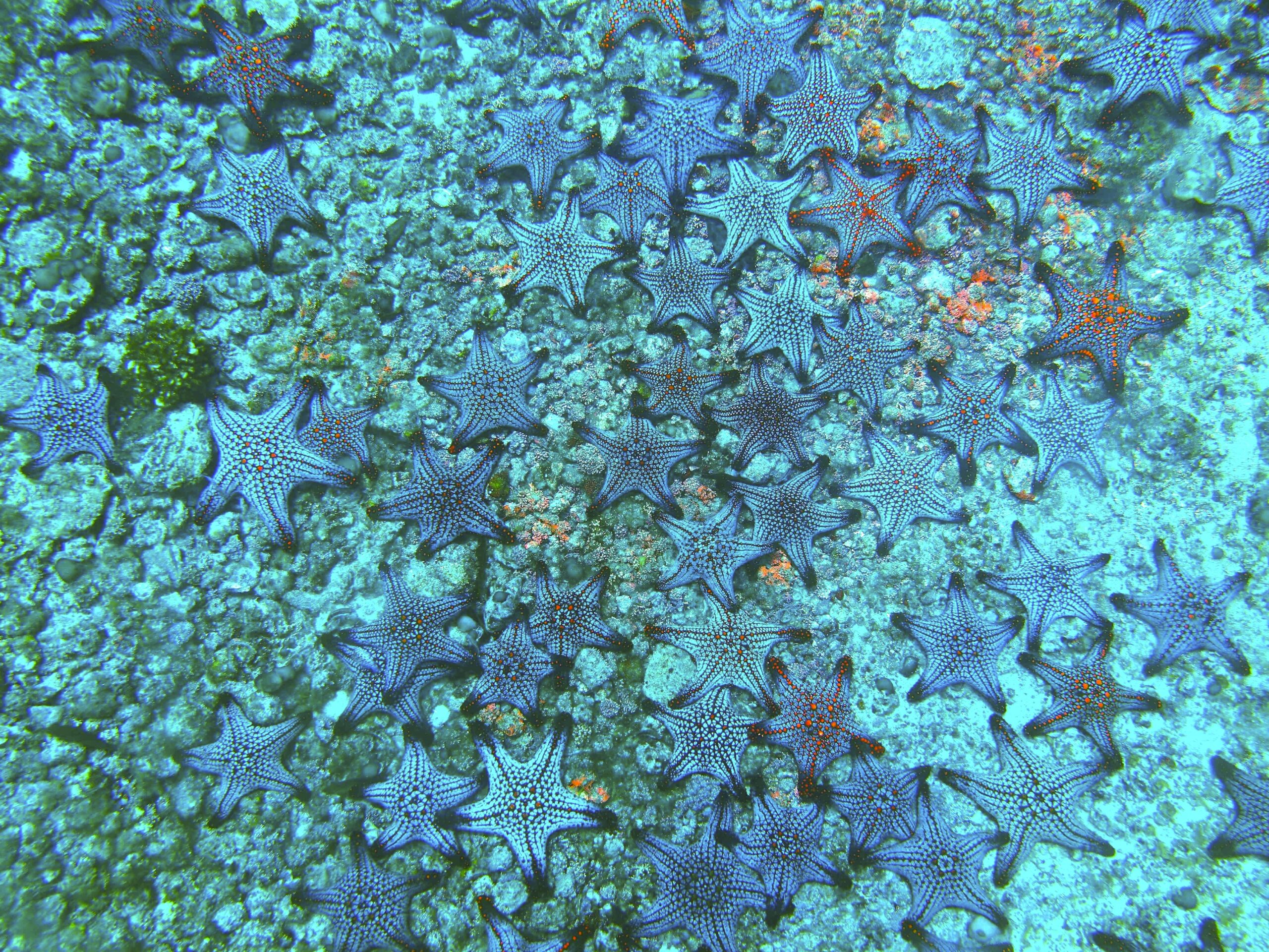 La Estrella (Aladdin’s Rock) is a calm, easy-to-navigate dive that starts with a shallow 15-foot (5 m) descent onto rocks hidden at high tide. The southern slope drops to 80 feet (25 m), while the eastern and northern sides rise into sandy patches and big boulders, creating a relaxed terrain of terraces and gentle ledges rarely affected by swell or current. Along the way, you’ll find large snapper, schools of shovelnose fish and jacks, whitetip reef sharks, green turtles, rays, octopus, and lobsters tucked into crevices. The shallow reef hosts hard corals, frogfish, seahorses, and—if you’re lucky—the site’s star attraction, the harlequin shrimp.