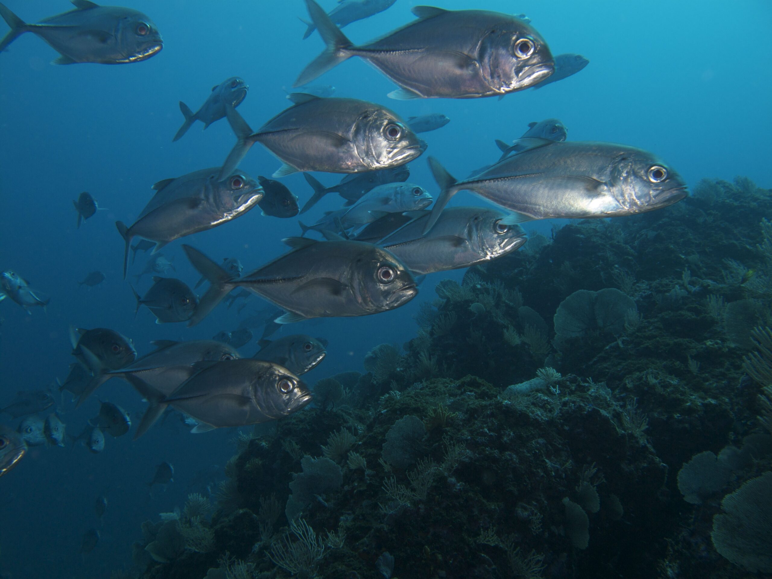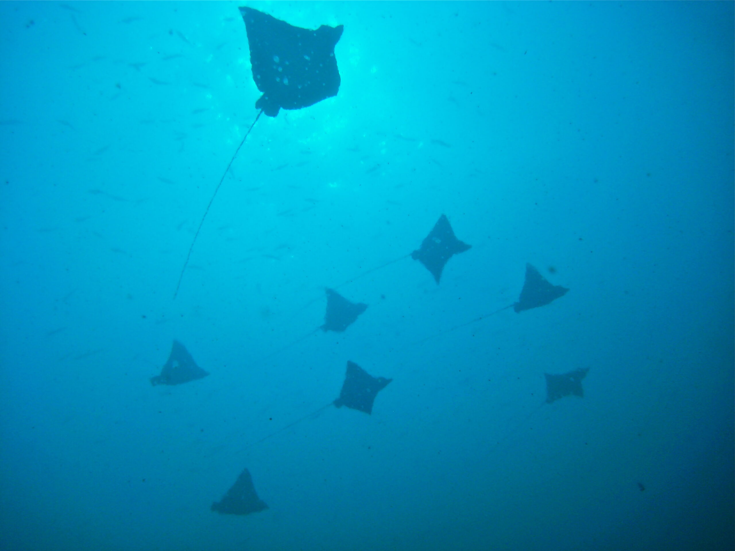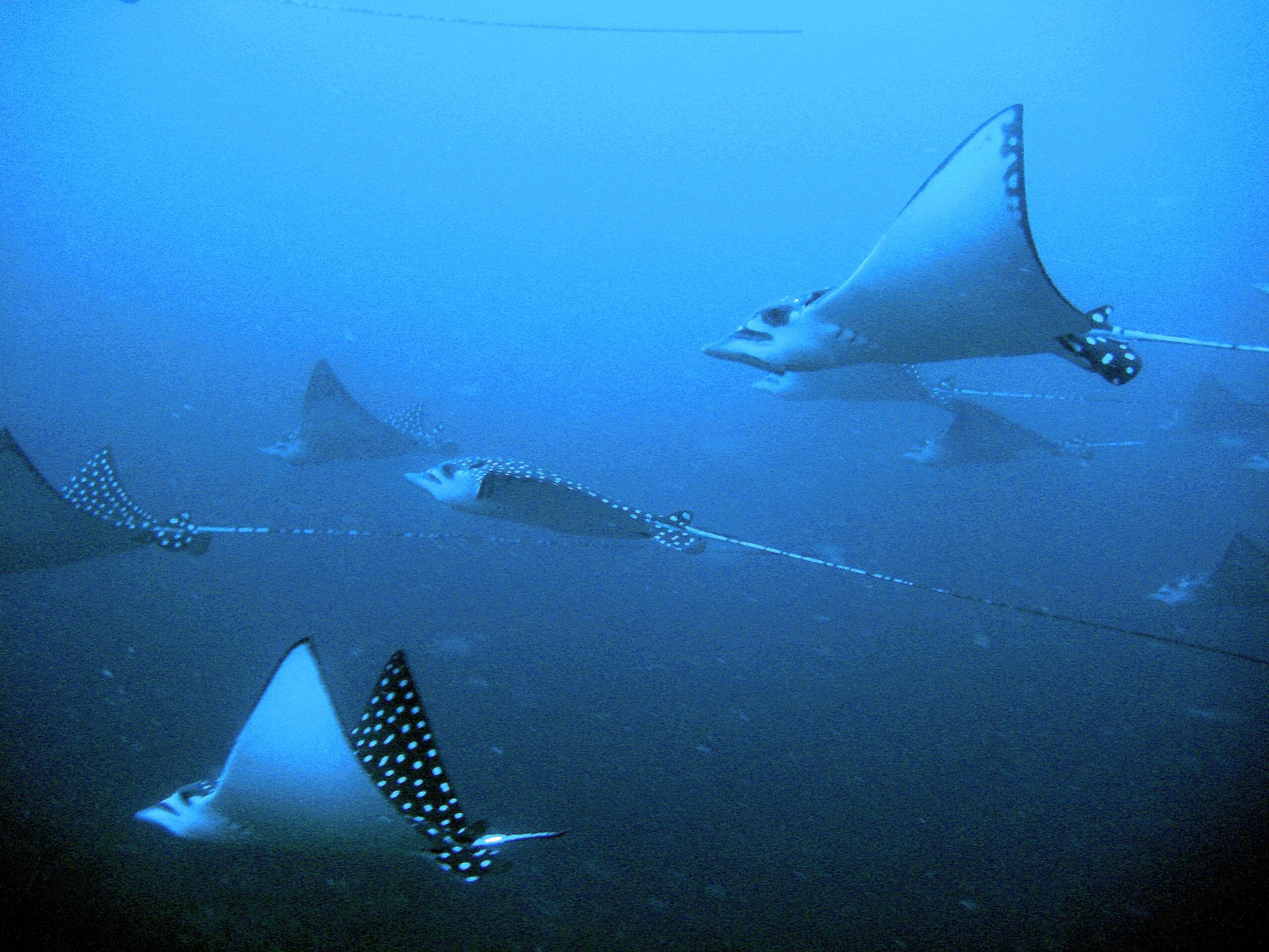 Because the site is fully exposed, strong currents and surge are common—and when the water is moving, the reef bursts with life. Large schools of dog snappers, Mexican barracudas, bigeye jacks, and bluefin trevallies sweep through in dense formations. Seasonal visitors such as longtail stingrays appear regularly, and lucky divers may encounter hammerheads, silky sharks, or even giant mantas gliding out of the blue. On the rocky bottom, groupers, snappers, gorgonians, and hard corals add texture and color to the terrain.