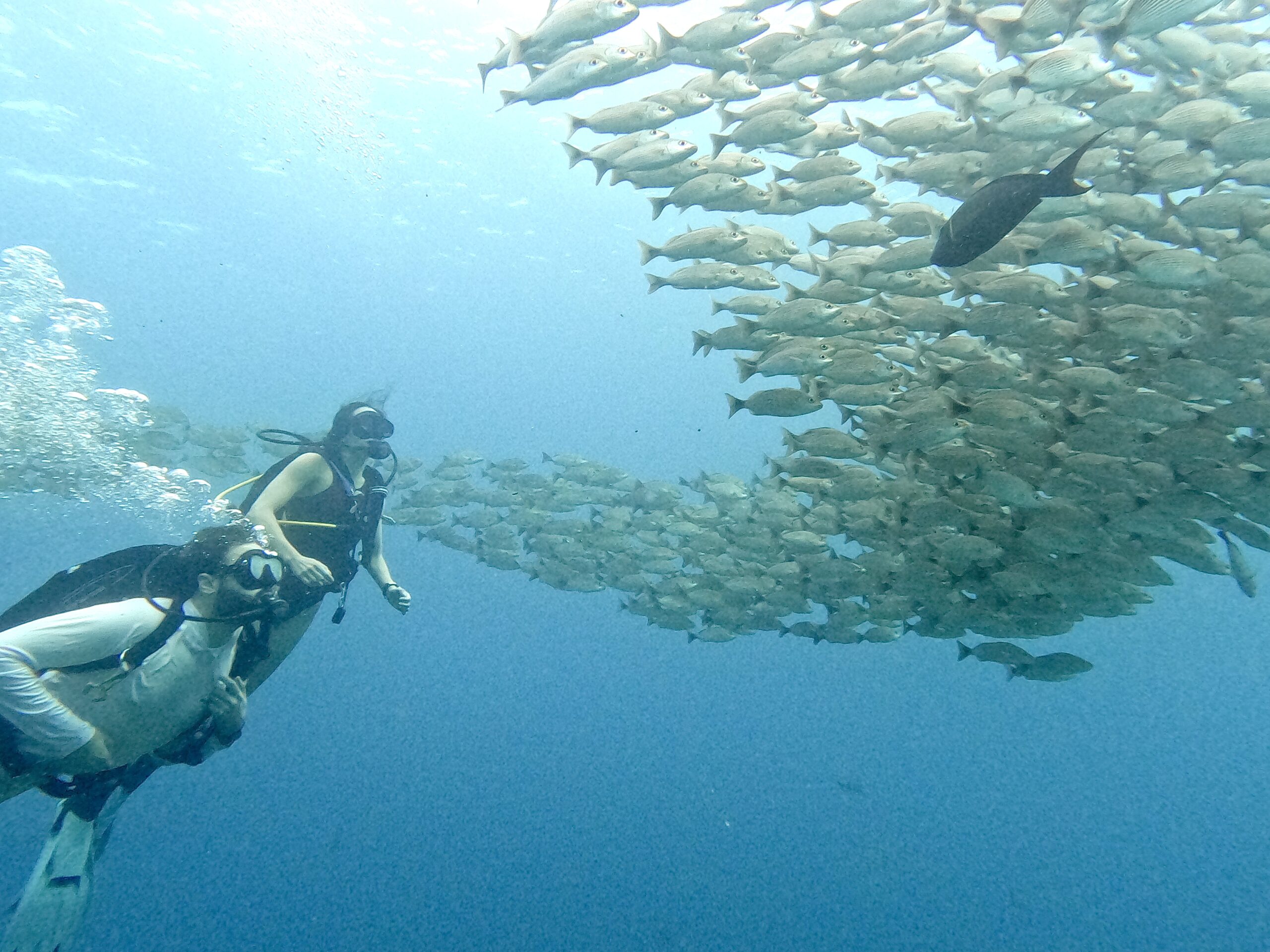 As you arrive at Wahoo Rock, the lone stone rising from the surface marks exactly where the adventure begins. Dropping beneath the waves, you enter a landscape of sandy patches and steep drop-offs. Currents—usually flowing from the east—carry clouds of plankton that draw in jacks, barracudas, spadefish, and on rare, lucky days, even whale sharks.